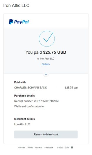 Thank you for renewing your membership with Iron Attic Fitness! If you included your email address during the payment process you should recieve an email from PayPal soon like the example below: